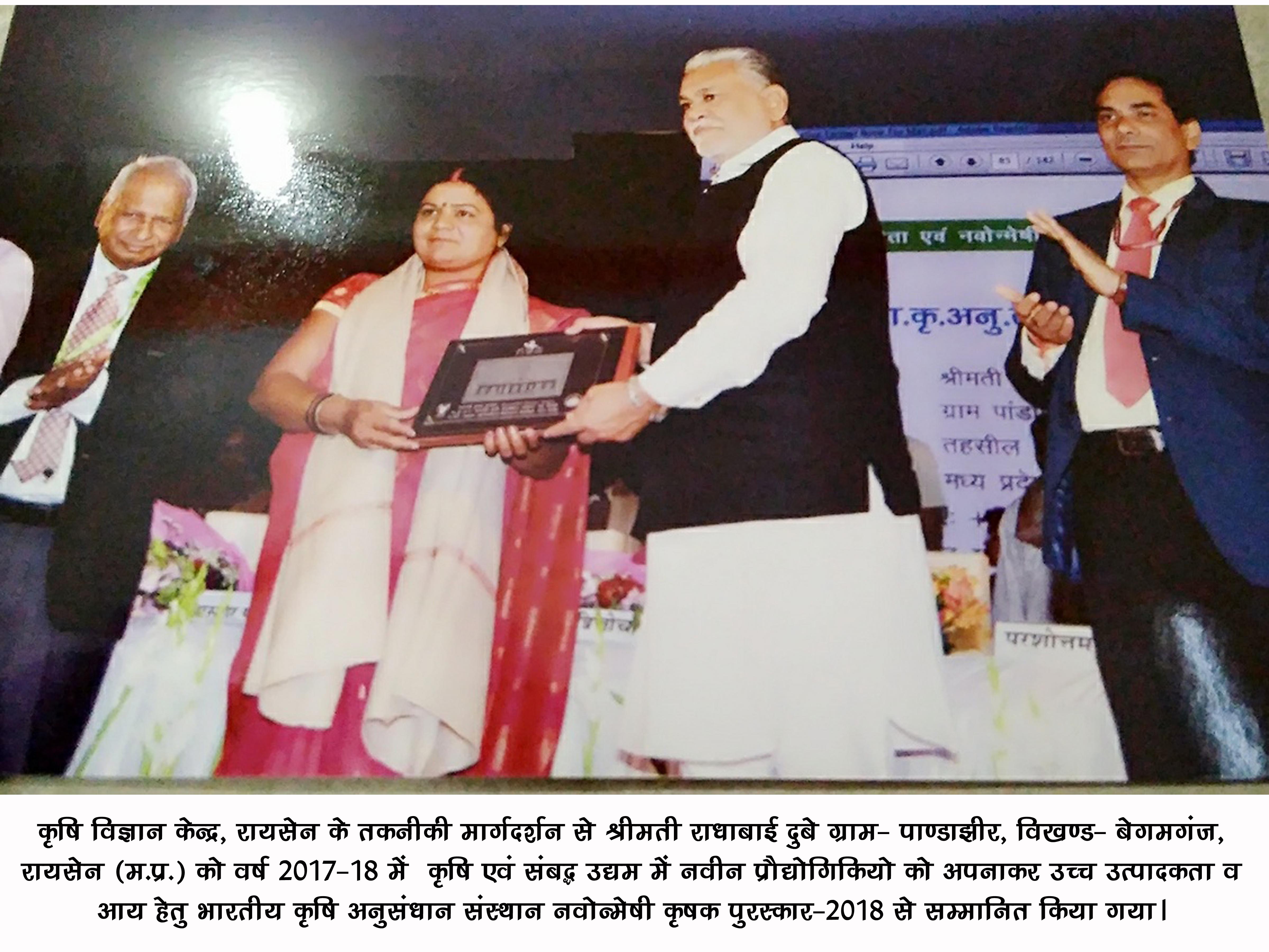 With the technical guidance of Krishi Vigyan Kendra, Raisen, Mrs. Radhabai Dubey, Village- Pandajhir, Block- Begamganj, Raisen (M.P.) was awarded the Indian Agricultural Research Institute Innovative Farmer Award-2018 for higher productivity and income by adopting new technologies in agriculture and allied enterprises in the year 2017-18.