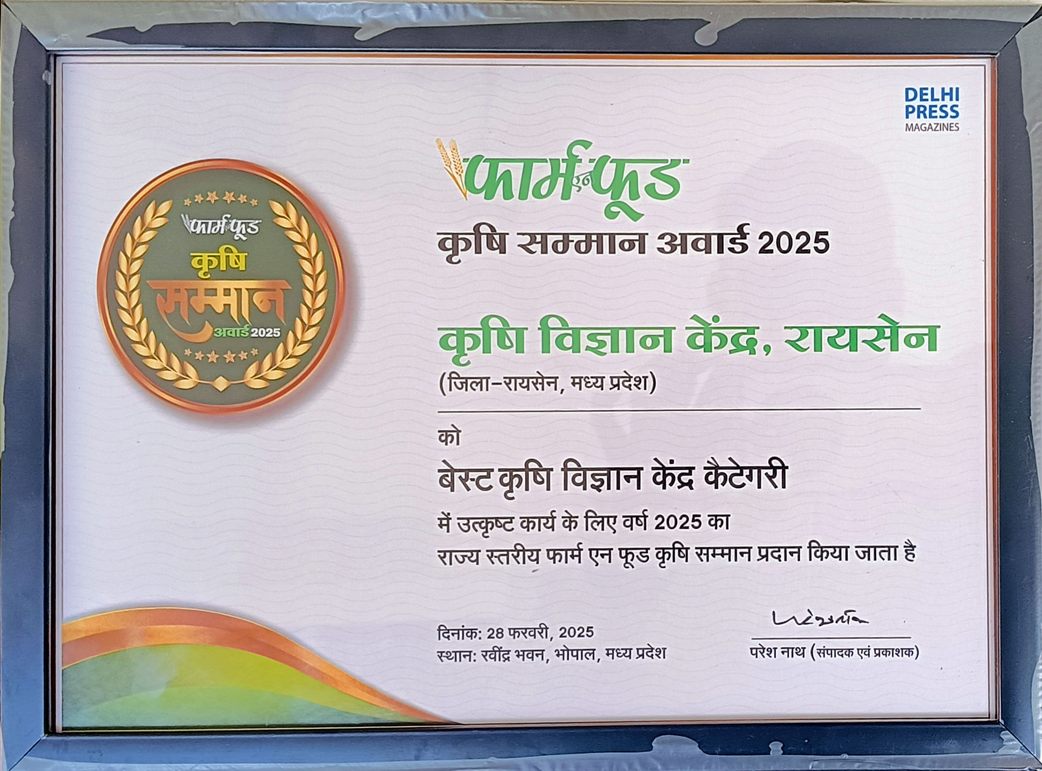 Name of award: Best Krishi Vigyan Kendra category Farm N Food Award-2025 awarded to KVK, Raisen (M.P.)