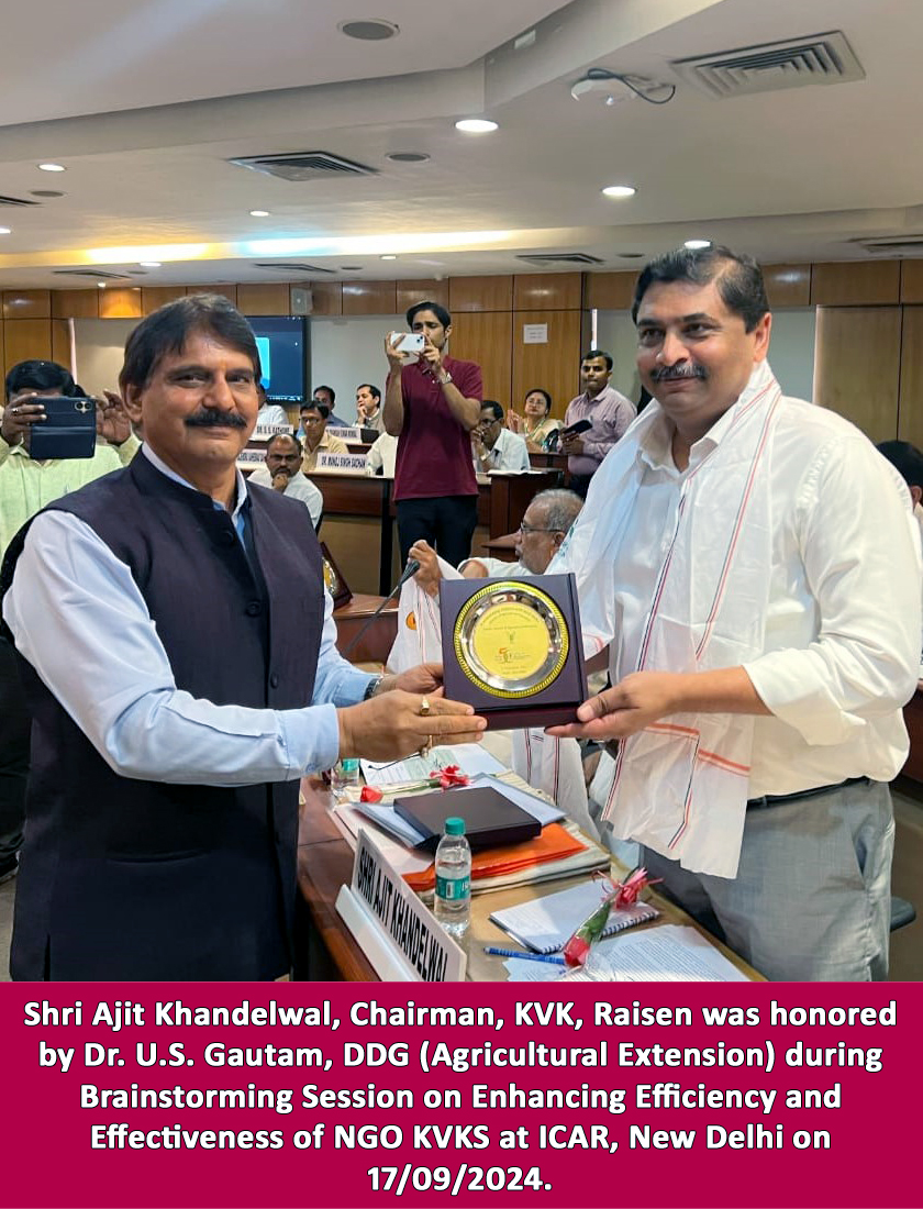 Shri Ajit Khandelwal, Chairman, KVK, Raisen was honored by Dr. U.S. Gautam, DDG (Agricultural Extension) during Brainstorming Session on Enhancing Efficiency and Effectiveness of NGO KVKS at ICAR, New Delhi on 17/09/2024.