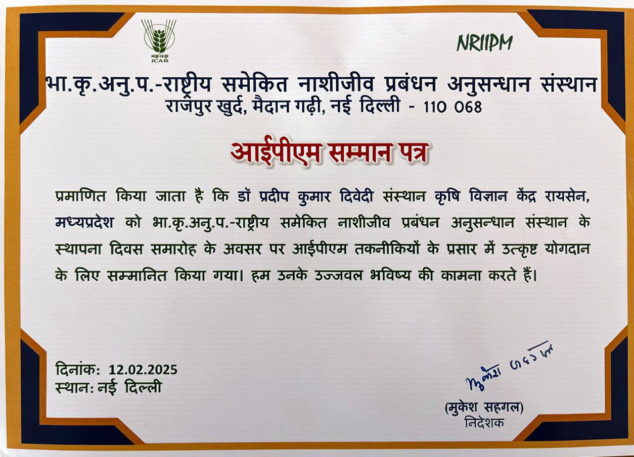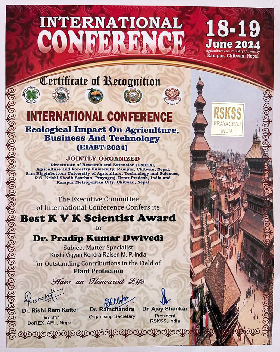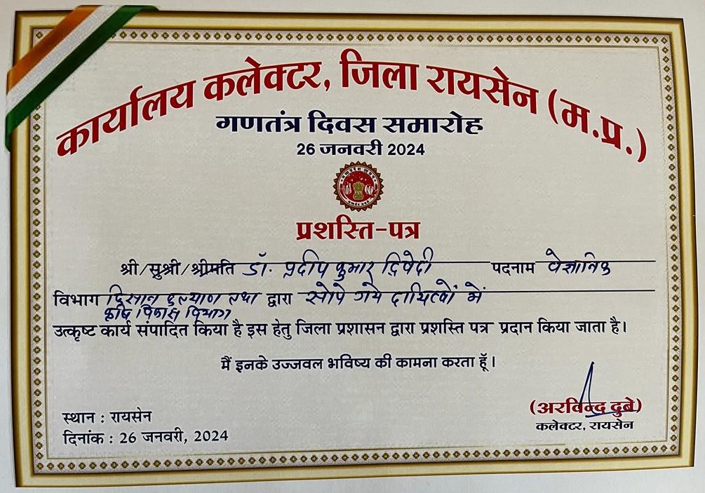 Name of Award: On the auspicious occasion of Republic Day celebrations on 26 January 2024, District Administration Raisen honored Dr. Pradip Kumar Dwivedi, Plant Protection Scientist of Krishi Vigyan Kendra Raisen, by presenting a letter of appreciation by the Honorable Collector for his excellent work in the promotion and technical guidance of advanced agricultural technology.