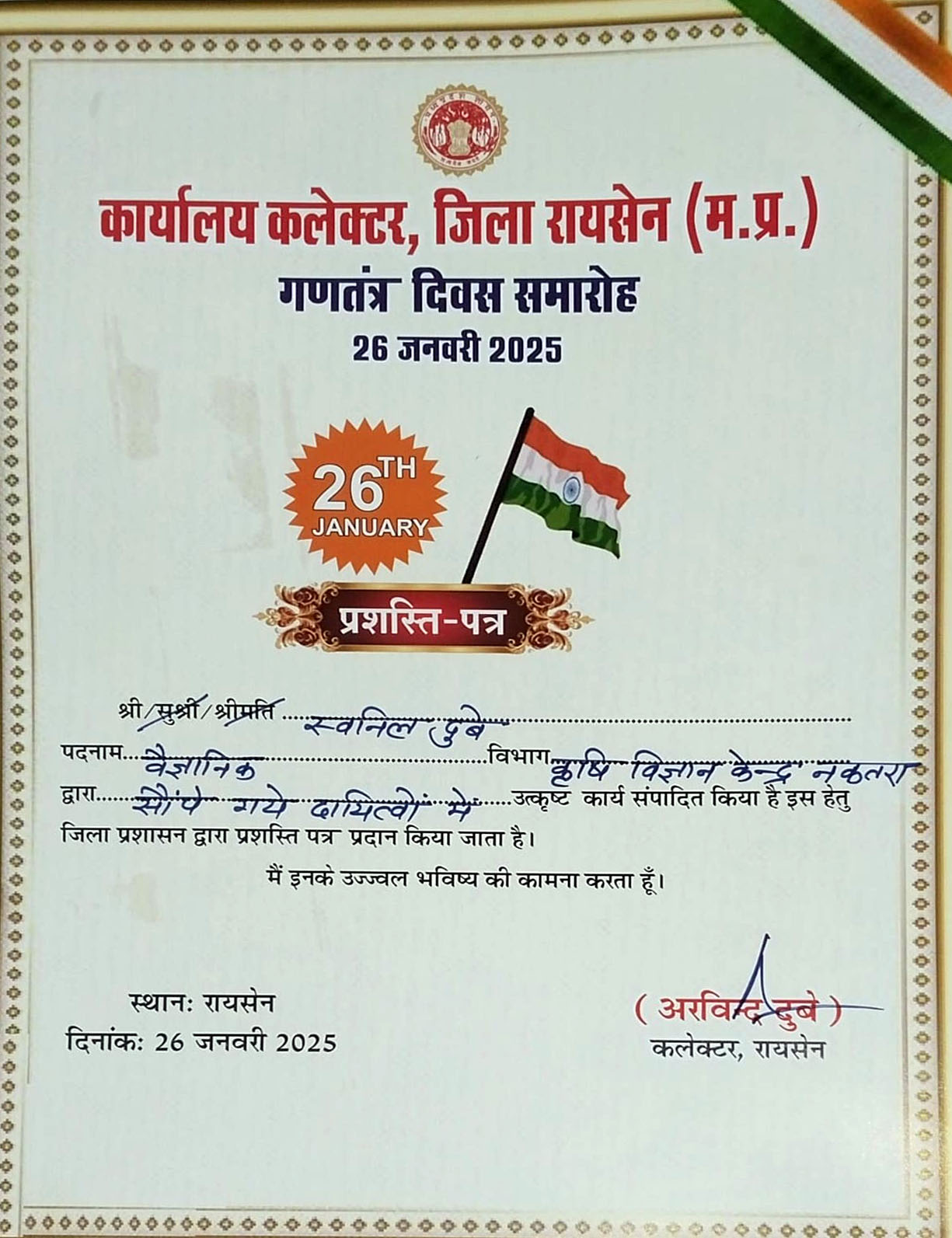 Name of award: On the auspicious occasion of Republic Day celebrations on 26 January 2025, District Administration Raisen honored Dr. Swapnil Dubey, Sr. Scientist & Head of Krishi Vigyan Kendra Raisen, by presenting a letter of appreciation by the Honorable Collector for his excellent work in the promotion and technical guidance of advanced agricultural technology.