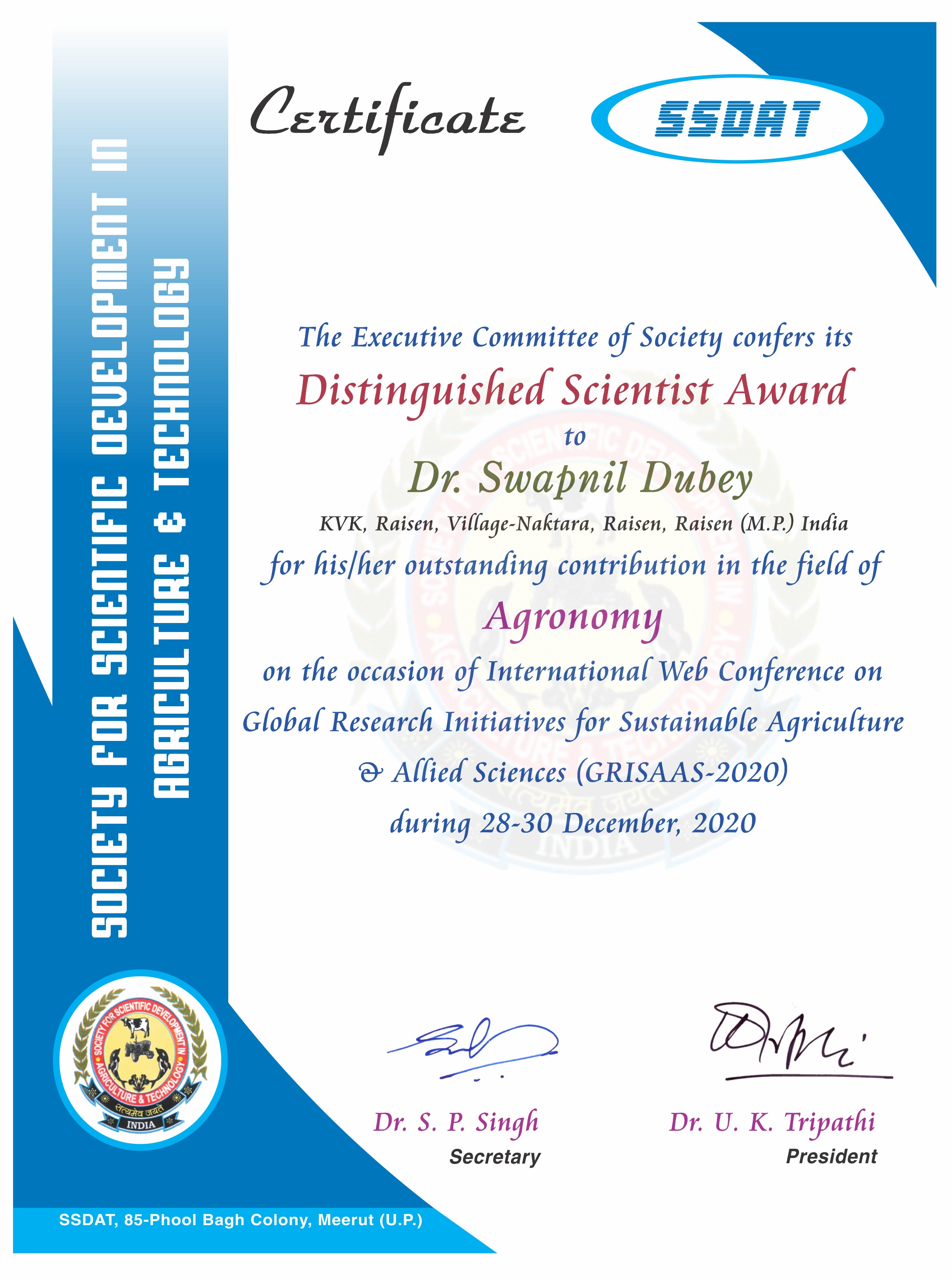 Dr. Swapnil Dubey, Sr. Scientist & Head, KVK, Raisen had awarded by “Distinguished Scientist Award” for his outstanding contribution in the field of Agronomy by SSDAT.