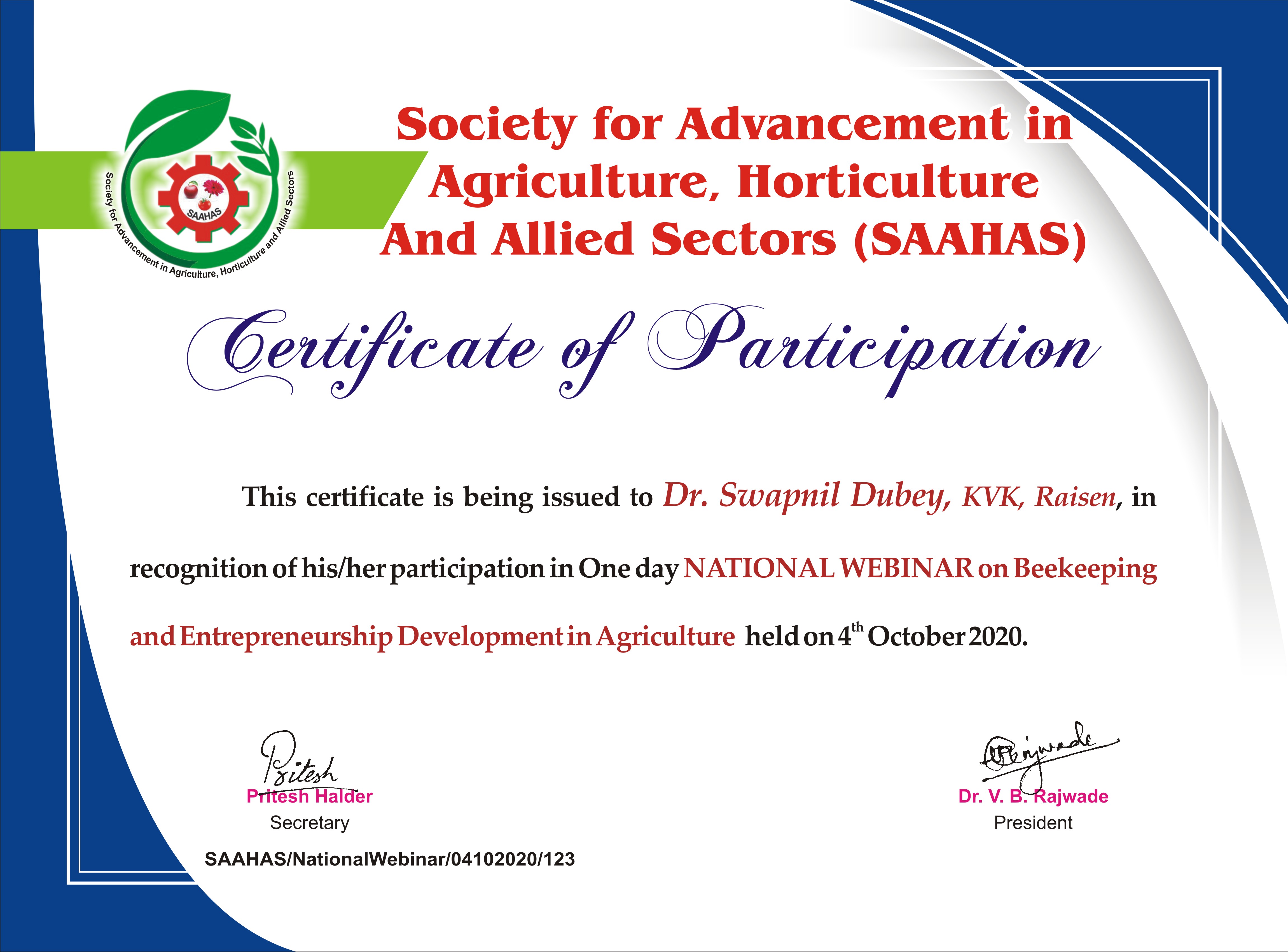 Dr. Swapnil Dubey, Sr. Scientist & Head, KVK, Raisen had awarded by “Certificate of Participation” in One day "National Webinar on Beekeeping and Entrepreneurship Development in Agriculture held on 4th October, 2020.